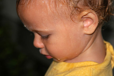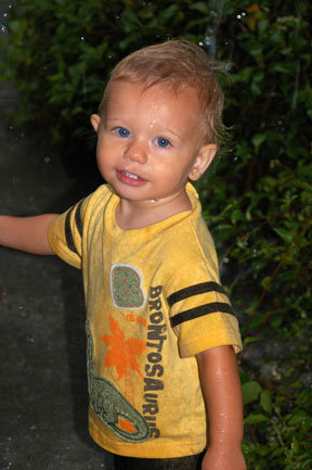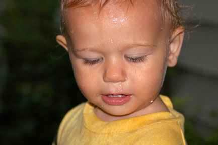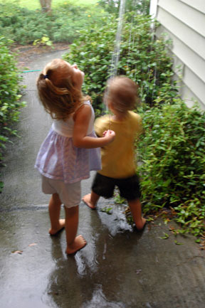 We sit on the very small front porch and they play in the water that runs down off the roof.